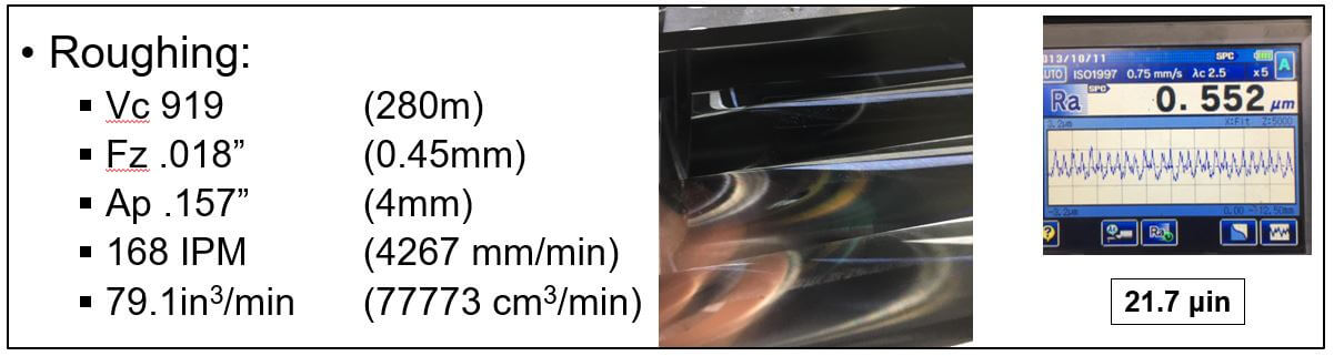 For instance, in the attached example, the FM10 produced a stunning finish of ~Ra 22μin at an astonishing MMR of 79.1 in3/min. Even more impressive, with exactly the same cutter and inserts (yes, with used edges), it went on to produce a brilliant finish of Ra 6.2μin. It’s a one-tool face-milling solution offering unparalleled productivity and versatility – easily the best value in the market today for face milling.