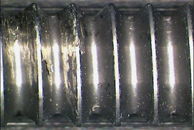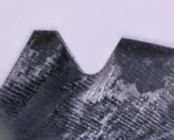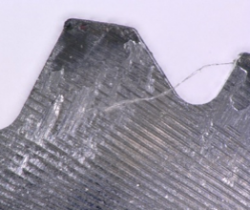 The picture above shows a chip that has been jammed while reversing. This type of welding can occur when machining Al alloys and using taps with high relief angles.