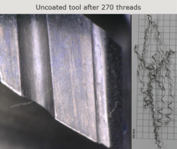 In both cases, function and thread quality is not affected by these deposits. Accuracy to gauge is also comparable and there are neither built up edges nor chip welding in the flanks. The deposits eventually level off and do not tend to increase with further usage of the tools.