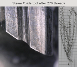 After a few threads, both tools show material deposits in the chip flutes. These deposits are generally more visible on the steam oxide tools due the dark color of the material. An analysis of the tools may lead to a determination that there is more build up on the steam oxide treatment than the uncoated tools. This, however, is not the case. The material built up on both tools is very much the same.