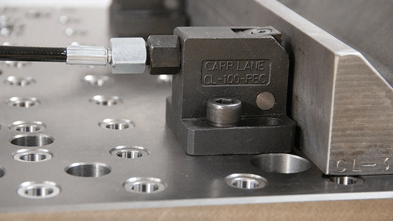 Also new at Carr Lane are mechanical zero-point systems that attach directly to the workpiece. Frost explained that the DropZero system provides for clamping and locating in a single device, and are designed for use with the company’s modular sub-plates and blocks. “They can also be mounted to one another to support uniquely shaped workpieces,” he said.
