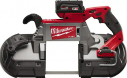 This Milwaukee bandsaw takes lithium-ion batteries (series M18) which come with the tool. The bandsaw can operate at up to 380 RPM. The maximum depth of cut with this tool is 5 inches.