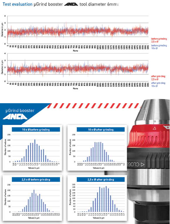 µGrind performance has been tested in real-life applications and the results are very consistent. A test was performed over a large batch of 6mm tools where runout was measured before and after grinding at 2.5 x Ø and 10 x Ø. Even with thousands of clamping and diameter changes, the runout remained virtually unchanged.