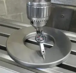 The tramming ring is placed on the table of the mill and is used as the foundation for the your indicating setup. This tool will really allow your positioning of the milling head to be precise. It is a ring that is ground on both sides. Tramming rings can be difficult to find online and you may just end up making on yourself!