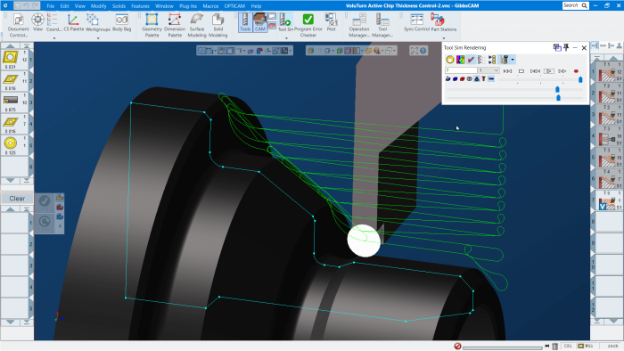 Other enhancements include a new option in most Turning processes to control Cutting Load Variation in order to suppress resonance-induced chatter and improve chip breaking for CNC machines. This machine capability is also called variable spindle speed by Okuma, and low frequency vibration by Citizen. VoluTurn functionality has also been extended to manage the active control of chip thickness during the cut by varying the feed rate instantaneously with any changes in cut depth.