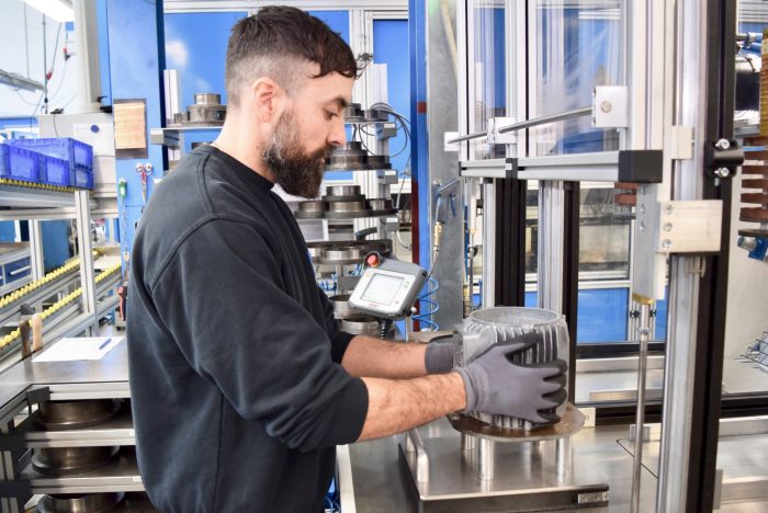 Last step: The motor winding is inserted into the heated (and thus expanded) empty stator housing.