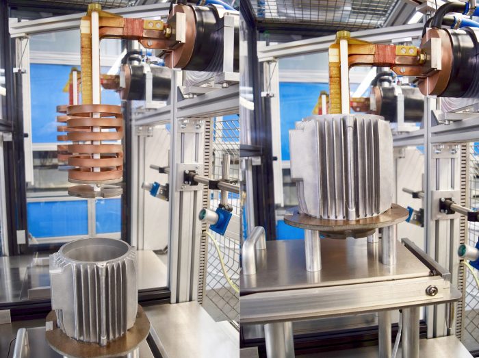 Overall, a very safe and quick process is put into effect around the custom-designed UNI HEAT system: The operator grabs the empty housing with protective gloves, places it in a custom-fit workpiece carrier and pushes it inside the machine. By closing a sliding door, he starts the following process: The component moves upward into its home position. This leads the induction rod to “plunge” into the empty housing enclosure. The subsequent heating process lasts only 30 to 120 seconds depending on the size of the component. Once it is completed, a warning lamp signals to the operator that the component can be removed. He places it in a mold, which is ready at the cooling location, and pushes the motor winding from the top inside. After a short cooling process, the motor is fully combined and ends up on a conveyor belt to the next processing step. “We produce about 250 motors per day in this way,” says Steffen Müller from Quality Assurance at Elektror. “The component sizes change regularly and yet the process stays perfectly stable. There are absolutely no issues or faults.” Which is partially due to how simple it is to retool the machine in the event of a component change: The operator closes the water supply, loosens two screws on the inductor mount and can then remove the tool and replace it with a new one. The workpiece holder is merely set down and can therefore, easily be removed from its support and replaced. “Including the program change on the control module, the entire retooling process lasts only about one minute. Various safety features prevent operator errors,” says Müller.