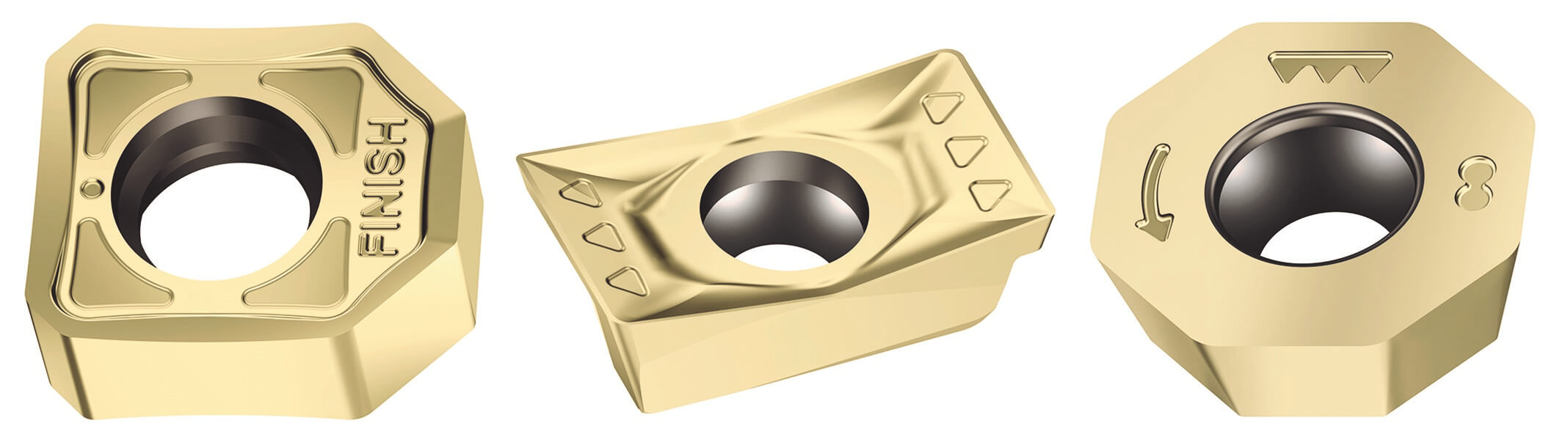 The insert’s fine-grained carbide substrate is coated with an aluminum titanium nitride (AlTiN) functional layer for the best layer bonding topped with a gold-colored zirconium nitride (ZrN) top layer. Users are able to quickly detect insert wear as the gold layer is eventually removed during use to reveal the charcoal black-colored functional layer.