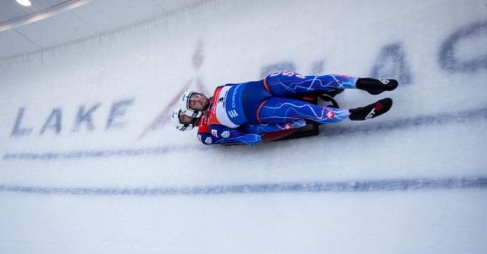 Chris Mazdzer (front) and Jayson Terdiman (back) of the United States race in the Lake Placid World Cup on Dec. 15-16, 2018. Photo by Ayden Meyers.