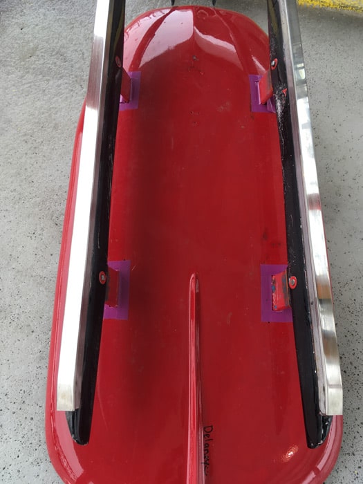 The steels, shown here on the underside of the luge, are waterjet-cut to within tight tolerances, then finished and tailored for each luge athlete.