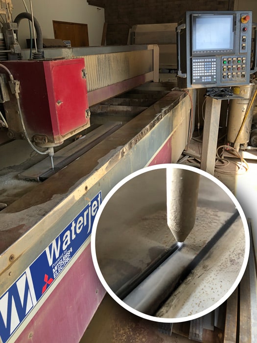 Previously it took the Accurate Waterjet team approximately 8 hours to cut three steels on a 55,000-PSI waterjet system with 80 HPA garnet. Using a waterjet with 80 HPX abrasive and the intensifier running at 70,000 PSI, the fabricator shortened the cut time by two hours.