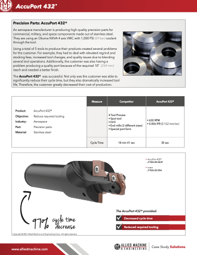 The products in Allied Machine’s AccuPort 432 product line are designed to deliver maximum performance in a diverse range of hydraulic port cutting applications and numerous industries. Indexable tooling such as this can provide a more cost-effective and higher performance solution anywhere a hydraulic port is required in a fraction of the time taken for traditional methods using separate drills, special forming tools and spot facers. These innovative designs deliver the best possible range of benefits in terms of productivity, cost per hole and tool life. Read on to see the real-life results of an indexable port cutting drill.