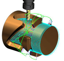 The advanced toolpath settings, such as controls for tool contact shift and point density, enable creation of smooth, highly efficient multi-axis roughing operations. Using the rest roughing capability, you can create machining operations for the uncut material from the previous operation. The helical entry ensures gradual engagement with the material, improving the overall machining process.