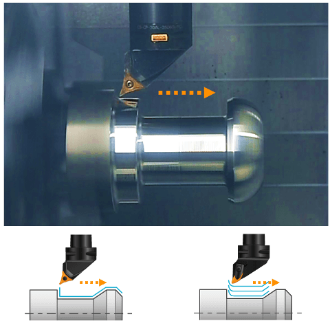 When using the PrimeTurning technique, the tool enters the workpiece at the chuck and removes material as it moves towards the end of the component, away from the chuck. This enables use of a small entering angle and more aggressive cutting parameters. Furthermore, you can use the CoroTurn Prime inserts for conventional turning – from part-end towards the chuck.