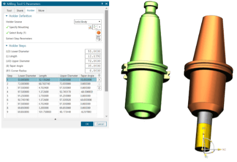 Automated Holder Creation. Tool vendors typically provide 3D models of their tool holders. However, these 3D models can’t be used directly for NC programming in conventional CAM systems. It requires that the programmer manually input the tool holder parameters, such as the diameters and lengths of tool holder’s sections. This manual process can be time consuming and is prone to errors.