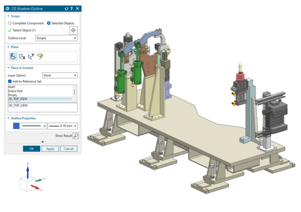 The newly enhanced 2D shadow outline feature allows you to efficiently create outlines for entire assemblies or a set of scoped selected content. By choosing simple or detailed outlines, you can employ advanced options like selecting a plane, changing colors, style and width, as well as assigning to a layer. This streamlines the authoring process, enabling completion in a single step. With this upgraded feature, you can quickly generate a 2D representation of equipment or sub-assemblies directly from the navigator or graphics window. You will receive a notification if outline creation encounters issues with bad or lightweight geometry. This alert helps identify and address potential problems in the outline creation process.