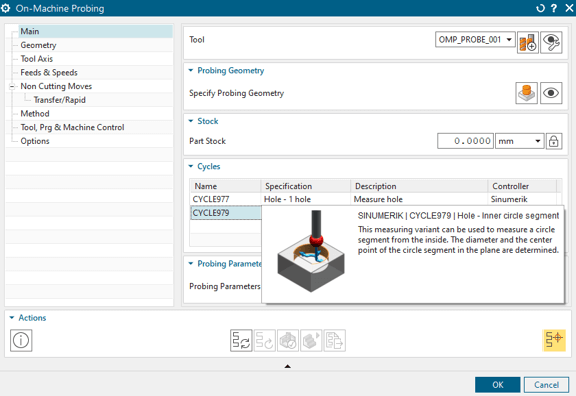 The latest enhancement in NX CAM On-Machine Probing, provides an intuitive user interface, where all parameter possibilities and available cycles are visualized with a tooltip and an image.
