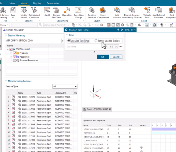 Detailed Takt time planning is now possible, allowing the planning engineer to set station-specific target Takt times, distinct from the assembly line target. This enhancement optimizes the overall production flow, ensuring smooth operation, especially for duplicated stations with longer processes. For instance, instead of the assembly line 60 second target Takt time, each duplicated station can have a 120 second target, accommodating alternating material flow while maintaining the assembly line validity.