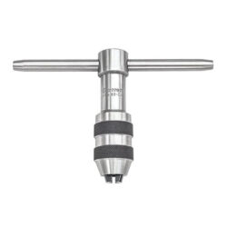 The T handle’s jaws conform to the tool being held, making it extra rigid and less apt to loosen its tight grip. The Starrett tap wrench has a sliding handle that is frictionally held, and it can be removed entirely or positioned so that leverage can be applied when working in close quarters.