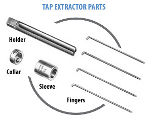 A tap extractor can be a life saver. They allow you to remove broken taps without having to drill or use an EDM and can help you avoid significant damage to the threads (if used correctly). Tap extractors have fingers that slide down into the thread and grasp the tap so that the broken tap can then be pulled out. It is important to be thorough and taking your time during the tap extraction process.